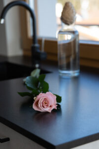 • Wohnküche mit Induktionskochfeld, Kühlschrank mit Gefrierfach, Backofen, Filterkaffeemaschine, Geschirrspülmaschine, genügend Kochgeschirr, Teller und Besteck